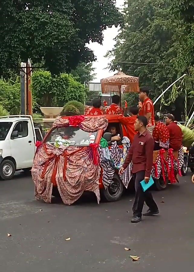 small, decorated car moving down an asphalt road. The car is covered in fabric with red and brown patterns, and there’s a small ornate umbrella or canopy on top. Several people, mainly young men, are either riding on or walking beside the car. They wear red or brown tops and dark pants. Some of the men are adjusting items on the car, and one is holding a blue paper. The car is flanked by a white truck parked on the left and a person on a motorcycle. Lush green trees and foliage line the road, suggesting an outdoor setting. The video is shot from a slightly elevated position and is vertically oriented.