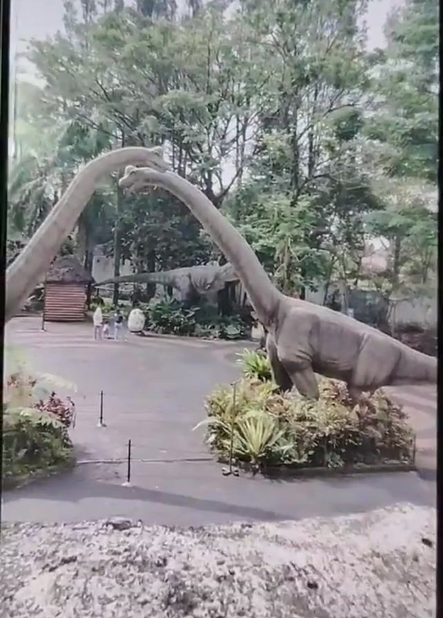 dinosaur park, focusing on two large, gray Brachiosaurus statues with long necks reaching towards each other. They stand on opposite sides of a paved walkway lined with greenery, appearing to "kiss." Several other dinosaur statues are visible in the background amidst lush trees. A few people, including a child, can be seen walking on the walkway between the Brachiosauruses. The video is taken from a slightly elevated position, possibly through a window or from a balcony, and the scene appears to be outdoors on a bright day.