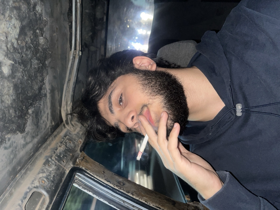 A young adult male with dark, wavy hair and a full beard is depicted inside what appears to be a vehicle. He is wearing a dark-colored hooded sweatshirt with a visible drawstring and clear toggles. His right hand holds a lit cigarette to his lips, with smoke emanating from it. The interior of the vehicle exhibits significant disrepair; the headliner is heavily damaged, peeling, and appears dirty, exposing underlying structural components. A blurred exterior is visible through the window on the left, showing streaks of light, while additional blurred lights are visible through a rear window or reflection on the right. The specific location within As-Salihiya Municipality, Syria, cannot be determined from the visual information provided in the image.