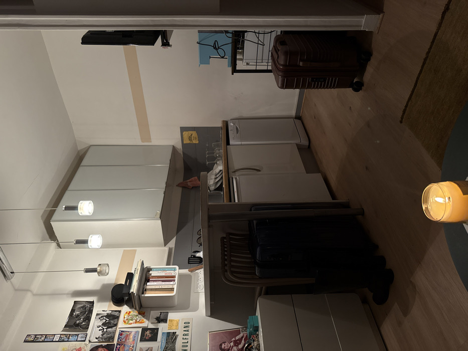 This interior scene depicts a compact apartment in Paris, France, characterized by dim, artificial lighting. In the immediate foreground, a lit candle in a glass container rests on a dark circular table, partially obscuring a brown area rug. To the left, a light-colored two-drawer dresser displays a framed portrait and a turquoise box. A dark blue wheeled suitcase and a folded chair are stowed beneath a bar-height counter that delineates the living area from the kitchen. The kitchen section includes a light grey countertop with a sink containing dirty dishes and glasses, and a red towel hanging nearby. Underneath the counter are a small white refrigerator, a white base cabinet, and a white dishwasher. Four light-colored wall cabinets are mounted above the countertop. Three pendant lights, with clear and frosted glass elements, hang from the ceiling over this area. The left wall is decorated with an array of photographs, postcards, and a sign displaying "VULFRANO." A white wall-mounted shelf unit, holding books and a black Bose speaker, is situated below the pendant lights. The adjacent right wall features a horizontal light beige stripe. A flat-screen television is wall-mounted near a doorway, below which a light blue coffee machine stands on a black metal shelving unit. A brown wheeled suitcase rests on the light wooden laminate flooring near the doorway. The entire visible floor surface is light wooden laminate.