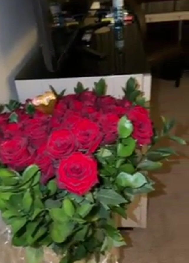 hotel room. A bouquet of red roses sits on a desk in the foreground. Behind the desk, a window shows a view of a bridge at night. There are two beds in the room.