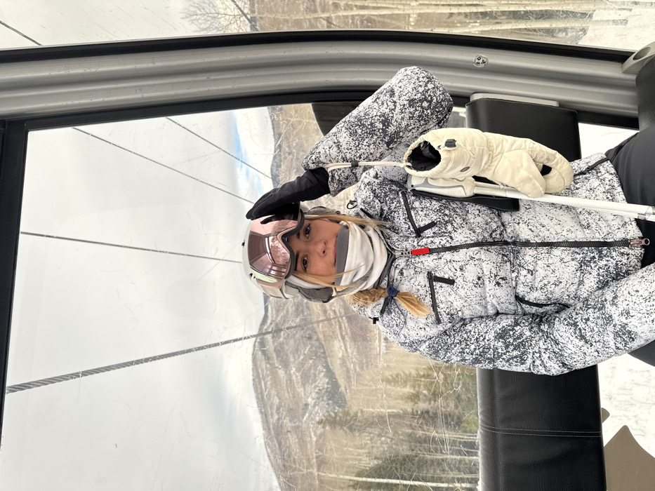 A woman sits in a gondola wearing ski goggles, a white neck warmer, and a white patterned ski jacket. Her blonde hair is in a braid. Black gloves adorn one hand, and her poles and another glove rest across her lap. Outside the gondola is a snowy mountain landscape.