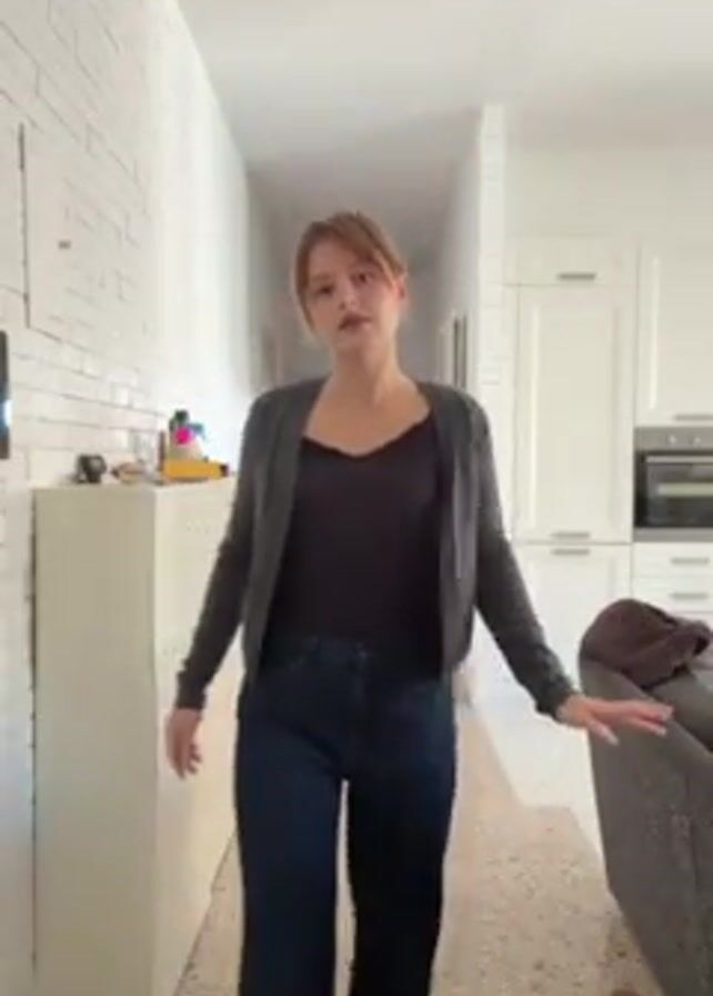 A woman stands in a brightly lit apartment hallway. She is facing the camera, wearing dark blue jeans rolled at the cuffs, a black top, and a dark gray cardigan. She has light brown hair styled in a casual manner. Behind her is a white brick wall on the left and the entrance to a kitchen on the right, with white cabinets and a built-in oven. A white storage cabinet sits to the left, near the wall, with various small items on top. The floor is a light-colored tile. She places her hands in her pockets, then turns and walks away from the camera, revealing she has her hair clipped back.