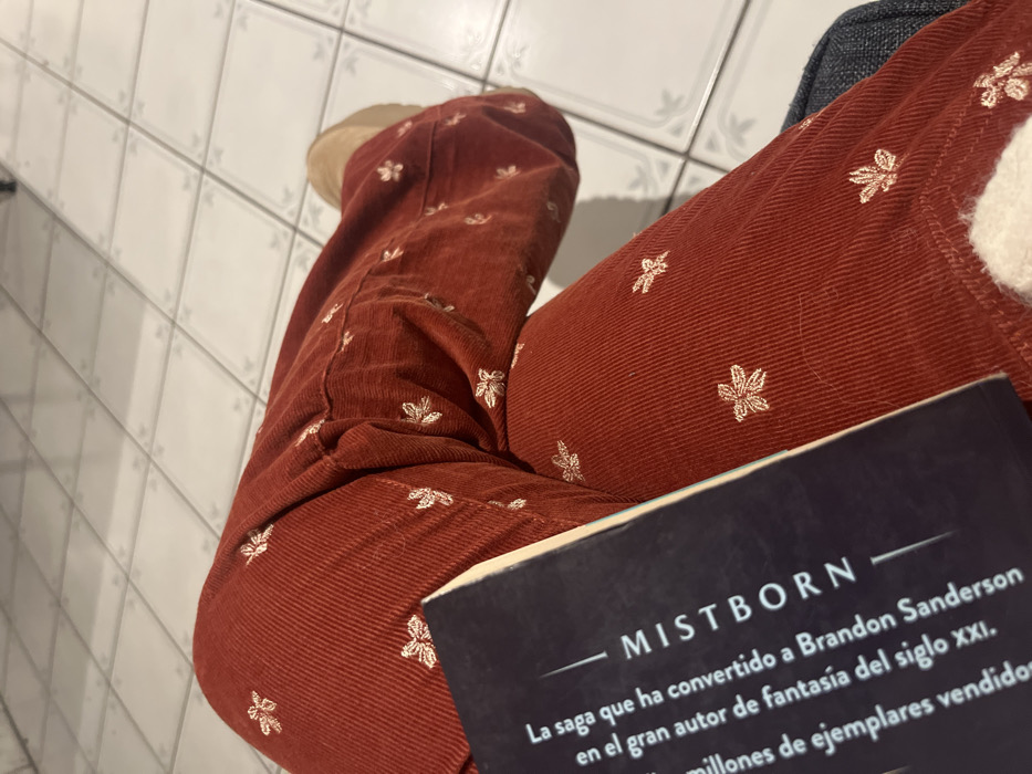 A person sitting with knees crossed, wearing rust-colored corduroy pants adorned with embroidered leaf patterns. The cover of the book "Mistborn" by Brandon Sanderson is visible. The book's tagline in Spanish states that the saga has made Brandon Sanderson the great fantasy author of the 21st century, with millions of copies sold. The background consists of square white tiles. A beige slipper is visible on the left foot.