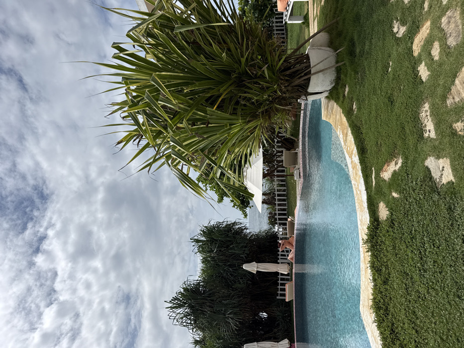 A sideways shot of a swimming pool, bordered by lush green grass on one side and decorative bushes with white umbrellas and lounge chairs on the other. Beyond the greenery, the open water meets the cloudy sky. A large potted plant with long, green leaves dominates the upper part of the scene, adding a tropical touch to the outdoor leisure area. The pool's blue water reflects the sky, creating a serene atmosphere.