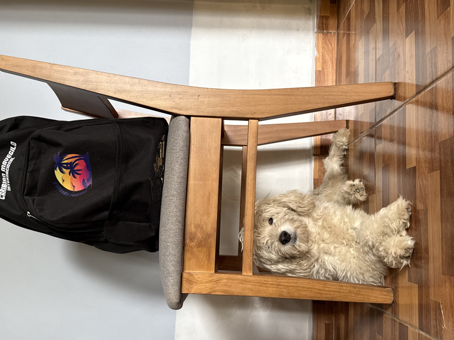 A small, fluffy, cream-colored dog lies upside down underneath a wooden chair on a brown tile floor. The chair is partly obscured by a black backpack with a colorful tropical logo and white lettering. The chair has a gray cushion and sits against a white wall. The dog appears playful and relaxed, with one paw reaching upwards.