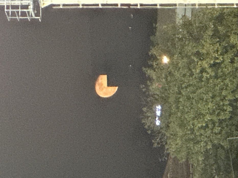 night scene with a quarter moon appearing as a Pac-Man shape against a dark sky