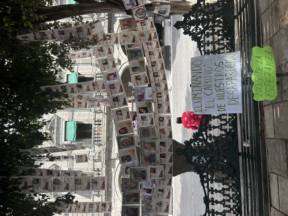 A plaza scene features a tree adorned with flyers, seemingly of missing persons, forming arches. A white sign reads "ILUMINANDO 'EL CAMINO' DE NUESTROS DESAPARECIDOS" (Illuminating the path of our disappeared). A smaller green sign proclaims "LUCES DE LA ESPERANZA" (Lights of hope). A person in a red sweater sits on a wrought iron bench. Names "ADIN", "CLARA" and "ARBOL ESPERO" (tree of hope) are etched on the bench.