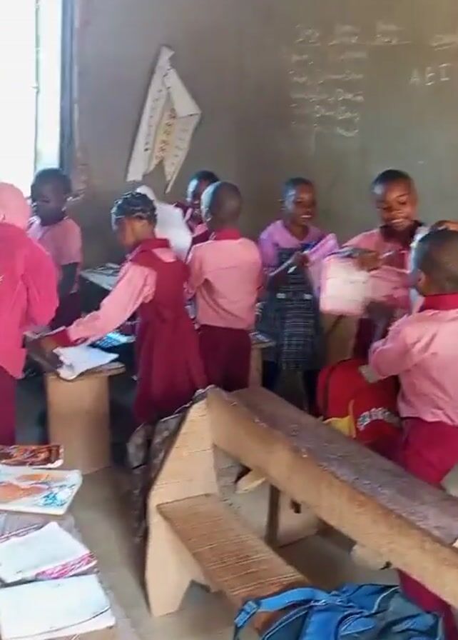 In an indoor setting resembling a classroom, a group of children are seen in a chaotic arrangement. They are dressed in pink shirts and dark maroon or red pants or skirts, possibly indicating a school uniform. The children are standing around wooden desks, some holding notebooks and papers. A few are smiling and appear to be animated or excited. The classroom has a window visible in the background, providing some natural light. Other classroom elements include a chalkboard on the wall and what looks like educational charts. Overall, the scene conveys a sense of a classroom environment with children who seem energetic and possibly engaged in an activity.