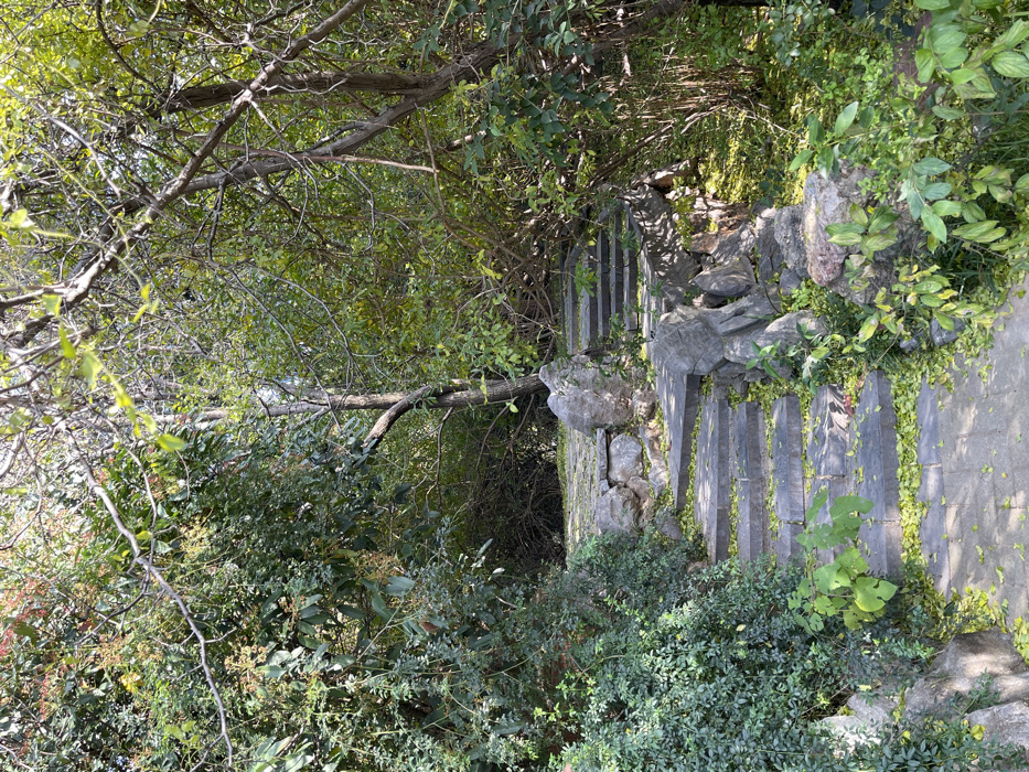 A stone staircase descends through dense foliage. The steps are gray and lined with natural rock formations. Overhanging branches and lush green plants crowd the path. Sunlight filters through the trees, dappling the steps with light and shadow. The scene evokes a sense of nature reclaiming a man-made structure.