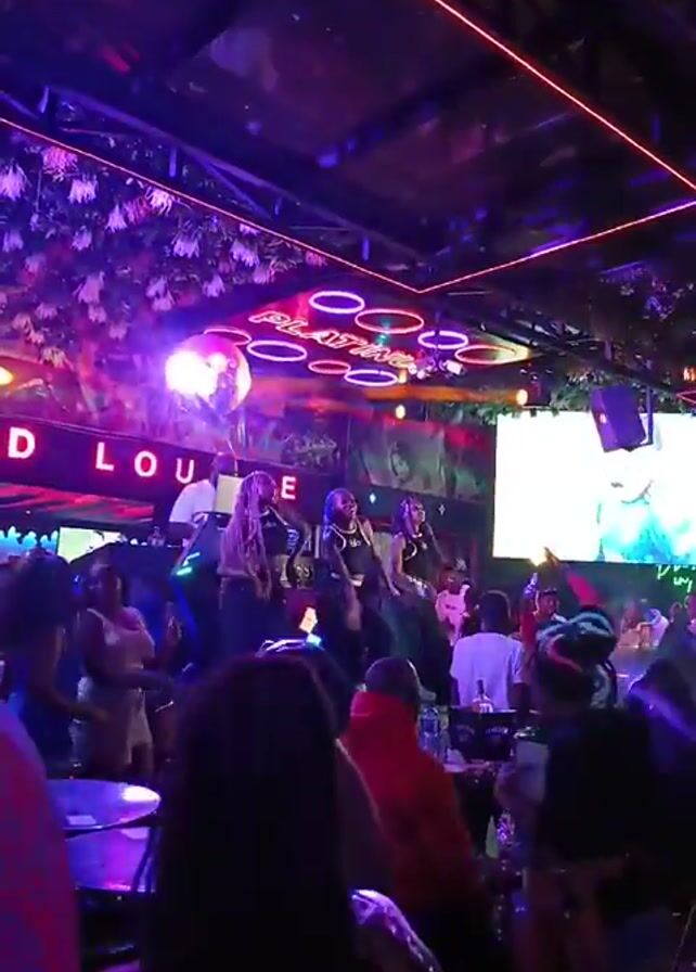 crowded nightclub or lounge, likely during a live performance. Several people are on a small stage, with at least three singers and one instrumentalist. The audience is densely packed, mostly facing the stage, some seated at tables. The club has a modern, colorful design, with neon lighting, a disco ball, and decorative foliage. The venue's name, "7D LOUNGE," is displayed in large, glowing letters. A screen behind the stage shows video images. Smoke or haze is present in the air. The camera is held by someone in the crowd, providing an audience perspective.