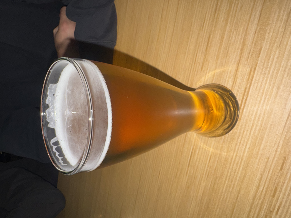 - "A tall glass of beer sits on a light wooden surface, a person visible on the left" by FM-jryY43, licensed under CC BY 4.0