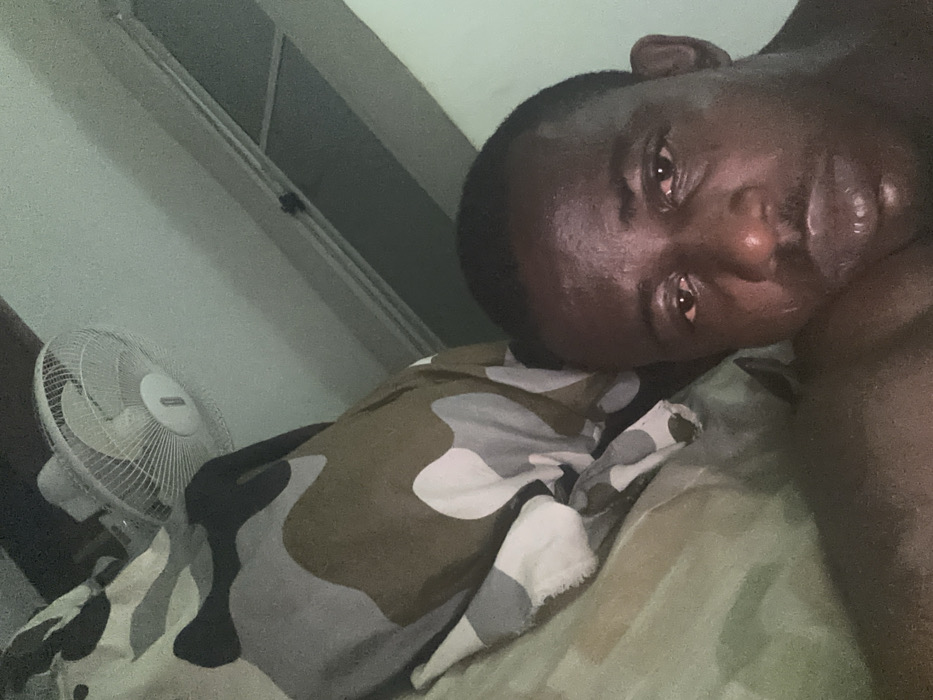An African American man lies on a camouflage patterned bedspread. His head rests on the pillow, his face turned towards the camera. He appears tired or pensive. A white fan sits on a table behind him. A window or wall is visible in the background. The image has a slightly grainy quality.