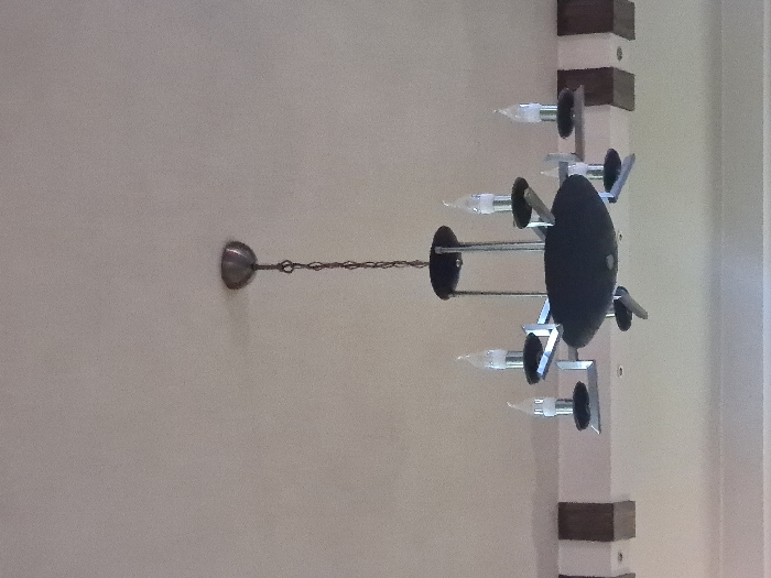 The image displays an interior view of a room in At-Tall, Syria, focusing on a chandelier suspended from a ceiling. The chandelier, of modern design, features a dark, possibly metallic central body and is suspended by a dark chain and canopy attached to a light-colored, flat ceiling. Six unlit, candle-shaped light bulbs are positioned symmetrically around the chandelier's central structure, mounted on lighter metallic arms. In the lower background, along the perimeter of the ceiling, several dark wooden or wood-toned decorative beams are visible. No people are present, and no specific actions or interactions are depicted.