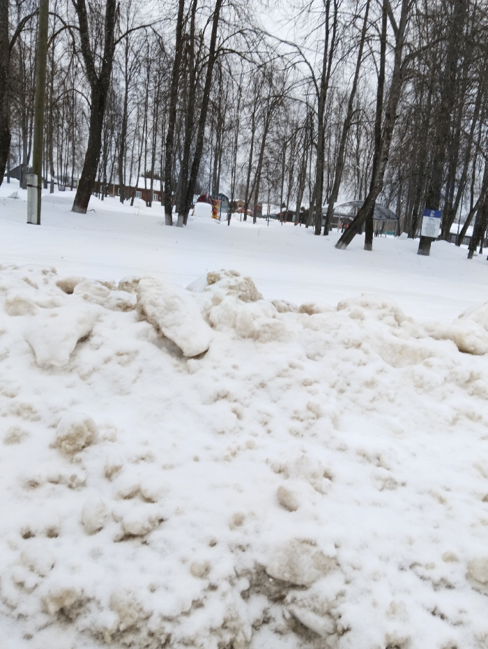 The image displays an outdoor winter scene in Красный Маяк, Russia, under an overcast sky. The foreground is dominated by a large, irregular accumulation of dirty, brownish-white, lumpy snow and ice. Beyond this, a wide expanse of clean, white snow covers the ground, dotted with numerous bare deciduous trees featuring dark trunks and branches; some tree bases are whitewashed. In the background, partially obscured by the trees, several low-rise buildings are visible, including structures with white walls and dark roofs, and one with a reddish roof. Faintly discernible are elements of a playground (yellow slide, red structure) and a blue and white informational sign. No individuals are present.