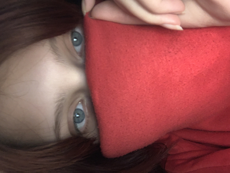 A close-up image, taken in Seoce, Montenegro, features the upper portion of a human face. The subject presents with reddish-brown hair framing a fair-skinned complexion, and light blue eyes. The lower face is concealed by a bright red, textured fabric, which exhibits minor pilling. A human hand, with visible fingernails, is partially visible on the right side of the frame, gripping the red fabric. The subject's eyes are open, with visible pupils that reflect a light source. The background is dark and out of focus, providing no discernible environmental details.