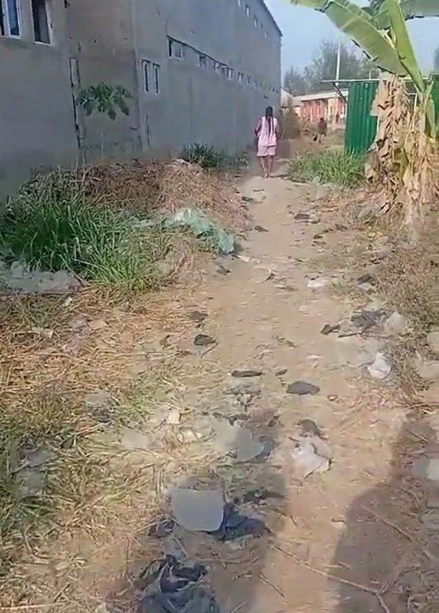 dirt path leading between a building and a cluster of banana trees. The path is littered with debris, including plastic bags and other trash. A person in a pink dress walks away from the camera down the path. A small dog or other animal can be seen briefly in the distance. The camera appears to be handheld, and its shadow is visible on the ground. The lighting suggests it is daytime.