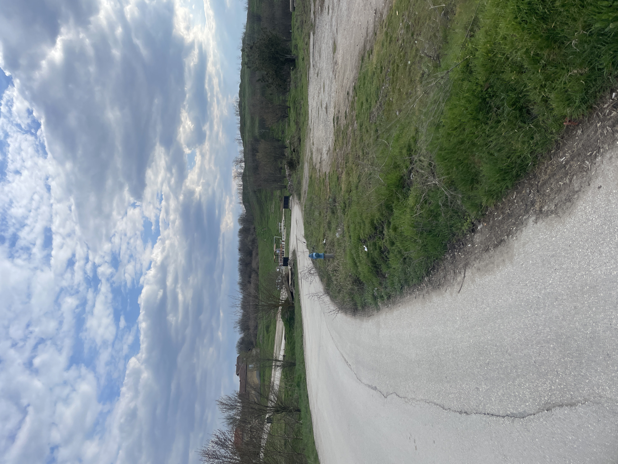 The image captures a semi-rural landscape within the city of Dolna Mitropolia, Bulgaria, under a predominantly cloudy sky. A cracked, light grey asphalt road curves from the lower left foreground, sweeping right towards the mid-distance. Adjacent to the road's right edge, a strip of green grass contains a single blue utility post. Beyond this, an unpaved, lighter-colored area, possibly a dirt lot, is visible, interspersed with patches of green grass and scattered bare-branched trees and bushes. In the mid-left background, a light-colored building with a dark roof is partially obscured by trees. Further right in the midground, an open structure with a white canopy and a dark, rectangular object are present. The background is dominated by a gentle, undulating hill covered in green grass and sparse deciduous trees and shrubs. The sky above is largely covered by white and grey cumulus clouds, with some clear blue sky visible and sun rays penetrating the clouds in the upper right quadrant. No individuals or animals are present in the scene.