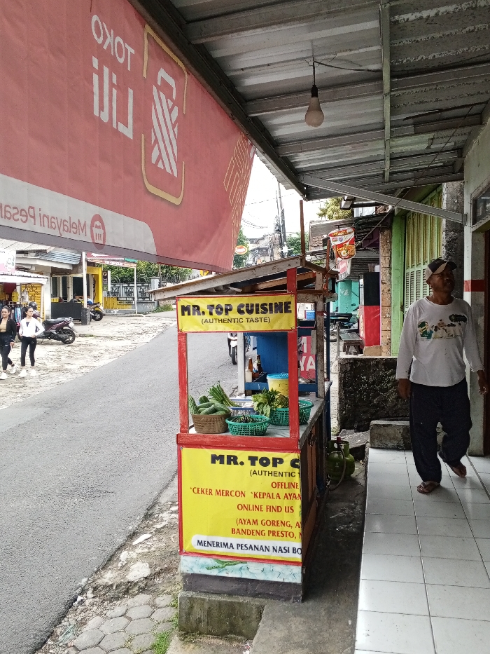 An outdoor street scene is depicted in the city of Voa Yeav, Cambodia, under a diffuse daylight sky. In the foreground, a portable red and yellow vendor cart, labeled "MR. TOP CUISINE (AUTHENTIC TASTE)" with additional Indonesian text detailing menu items and services, stands on a paved surface. The cart's upper shelf displays fresh vegetables including cucumbers and leafy greens in baskets. Below the counter, two green gas cylinders are visible. To the right of the vendor cart, an adult male walks left-to-right on a light-colored tiled pathway. He wears a white long-sleeved t-shirt with a graphic design, dark trousers, sandals, and a dark cap. His gaze is directed forward. Behind him is the facade of a building with a red-framed door. Above the vendor cart and extending across the upper frame, a large red banner bearing the Indonesian text "TOKO LILI" and "Melayani Pesanan" (Serving Orders) is affixed beneath a corrugated metal roof structure, from which a single bare light bulb hangs. To the left of the vendor cart, a paved road stretches diagonally into the background. Two adult females walk away from the viewer on the left side of this road. One wears a black top and black pants, while the other wears a white top and black pants, both with white athletic shoes. A dark-colored motorcycle is parked near them on the road's shoulder. Further down the road, additional buildings with varied facades (white, blue, yellow) and scattered trees are visible.