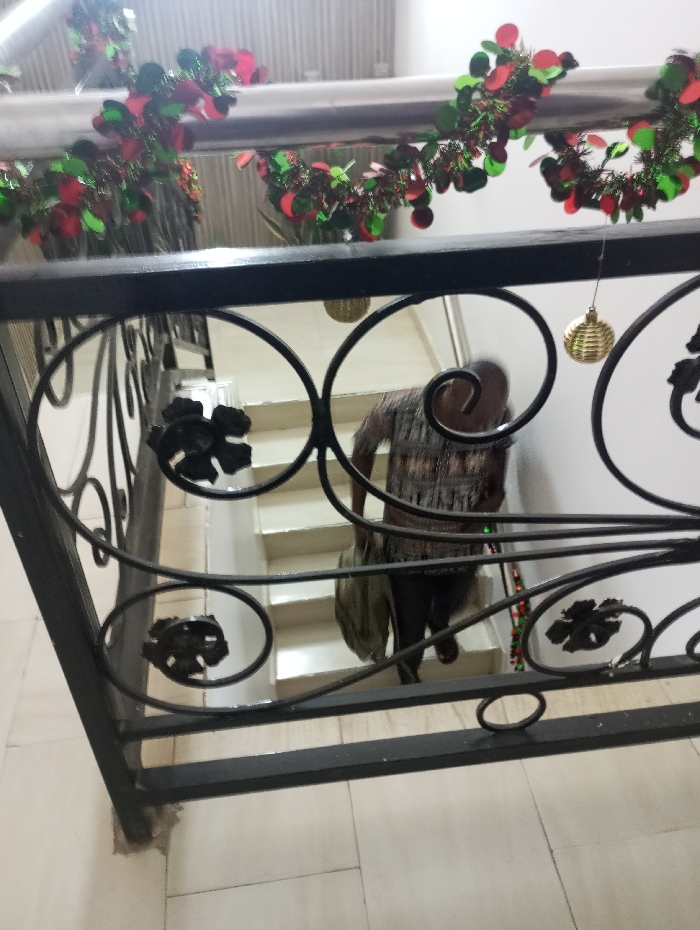 The image depicts an indoor staircase within a building located in Gwarinpa, Nigeria. In the foreground, a black wrought-iron railing with ornate scrollwork and dark leaf-like embellishments spans horizontally across the frame. Above the railing, a light-colored metal handrail is adorned with a festive garland composed of red and green tinsel and circular sequins. A single spherical, textured golden ornament hangs from this garland. Below and beyond the railing, a person is observed descending a light-colored, likely tiled, staircase. The individual wears a patterned, possibly plaid, long-sleeved shirt and dark trousers. They are carrying a dark-colored bag in their left hand. The person's face is obscured due to motion blur or low resolution. The floor on the upper level is tiled with light-colored square tiles. The overall environment appears well-lit.