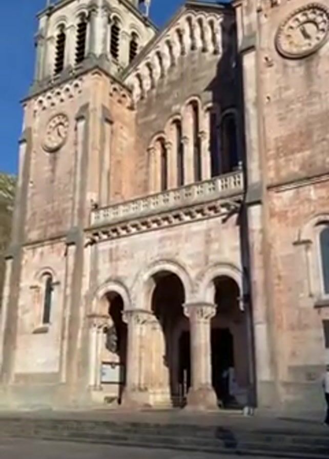 The video presents an exterior view of a grand church. The building is constructed of stone, featuring a prominent tower, arched doorways, and windows. Two clocks are visible on the church's façade. The sky is a clear blue, and the surroundings include steps leading up to the entrance and a plaza. The camera pans to reveal a statue on a pedestal, a tall green tree, and a backdrop of a mountain range. Several people are walking around the plaza.