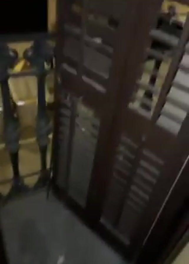 A first-person perspective video shows a person opening a brown door leading to a balcony