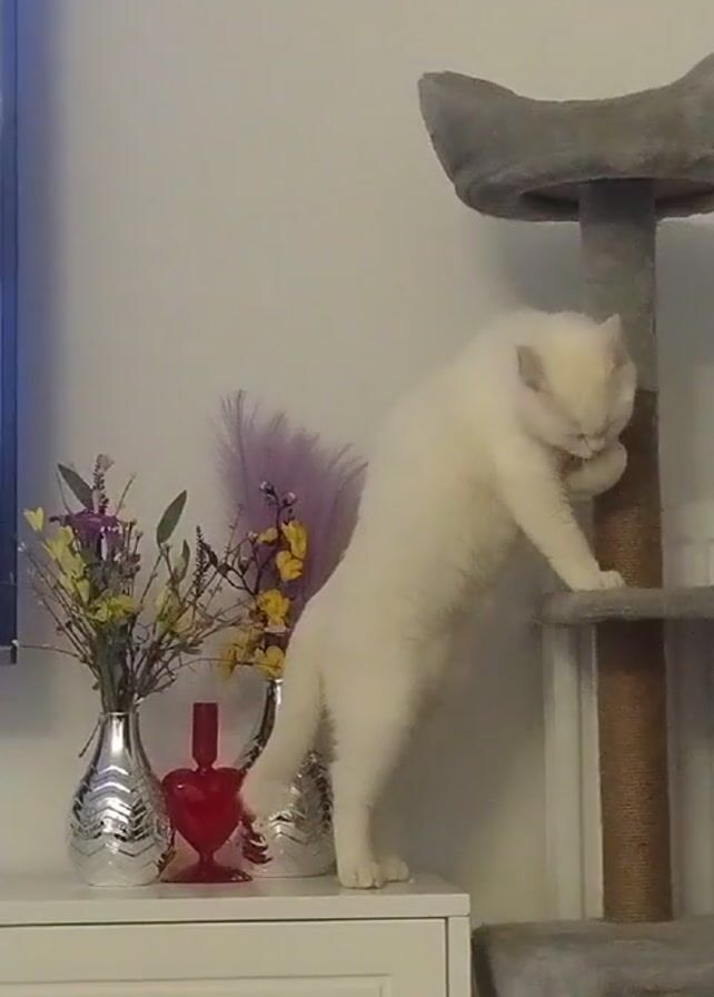 - "A white cat is standing on a white cabinet, scratching the sisal rope of a multi-tiered grey cat tree with its left paw" by FM-M4lpO2, licensed under CC BY 4.0