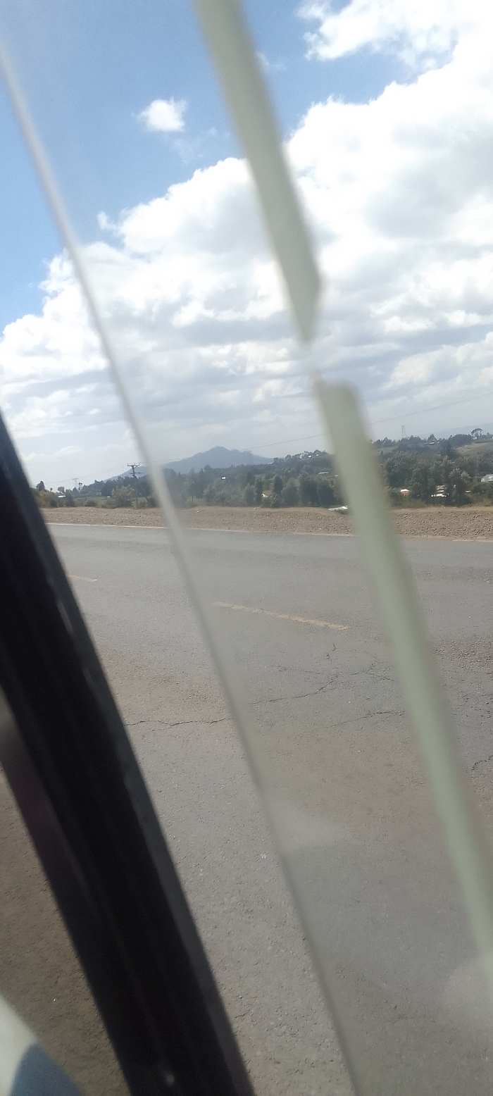 The image depicts an exterior landscape viewed from inside a vehicle, located within Naivasha East ward, Kenya. The foreground and mid-left are partially obstructed by a dark vertical vehicle frame element and several diagonal, opaque streaks from what appear to be window structures or reflections. The upper sky is clear blue with scattered white cumulus clouds. The horizon reveals distant, hazy mountains and hills covered in green vegetation, with scattered residential buildings and utility poles faintly visible. The mid-ground features a grey asphalt road exhibiting surface cracks and a faded yellow center line. A dry, light-brown shoulder separates the road from the further landscape. No people, specific actions, or interactions are observable.