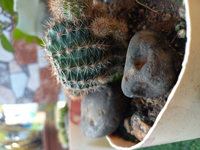 This image, captured in Barakin Lerawi, Nigeria, presents a close-up, ground-level view of a potted cactus. The central subject is a green, barrel-shaped cactus densely covered with numerous fine white radial spines and longer, reddish-brown central spines. To its right and slightly behind, smaller cactus offsets with similar reddish-brown spines are visible. The cactus is planted in a light cream-colored pot, possibly made of paper or biodegradable material, featuring a slightly irregular, torn-like rim. The pot contains dark brown soil, sparse small green plant sprouts, and two dark grey, irregularly shaped river stones. One stone, with an indentation, rests in the foreground, while a larger, smoother stone is positioned further back to the left of the main cactus. The background is significantly blurred, revealing a wall composed of irregular, multi-colored tiles in shades of brown, light blue, and white/cream. Further behind and to the left, an out-of-focus terracotta-colored pot with foliage is discernible, along with additional blurred green plant foliage. No people are visible.