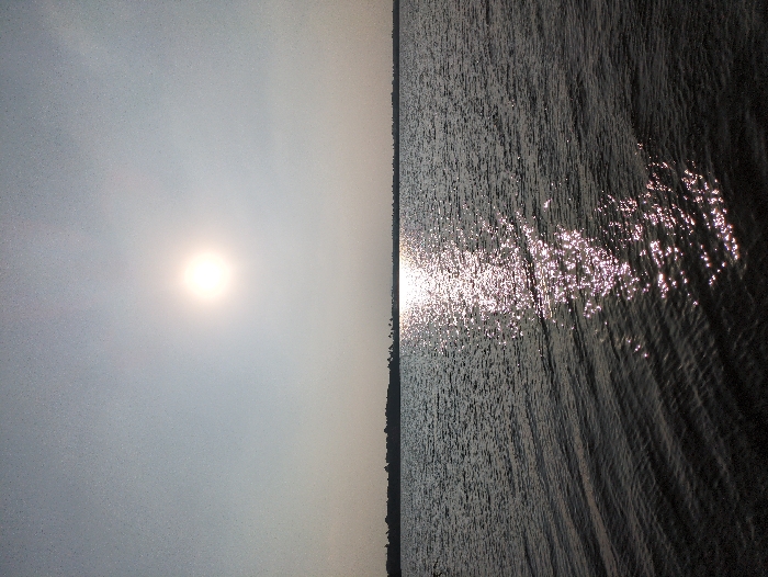 The scene depicts a wide expanse of water under a bright, hazy sky, located in Tiruvannamalai, India. The sun, appearing as a brilliant circular light source, is positioned in the upper-central portion of the pale sky. A distinct, shimmering column of reflected sunlight extends vertically across the dark, rippled surface of the water, originating near the horizon and propagating towards the foreground. A low-lying, dark landmass, showing faint silhouettes of trees or vegetation, is visible along the distant horizon line. No individuals, structures, or specific objects are present or discernible within the observable frame, and no actions or interactions are depicted.