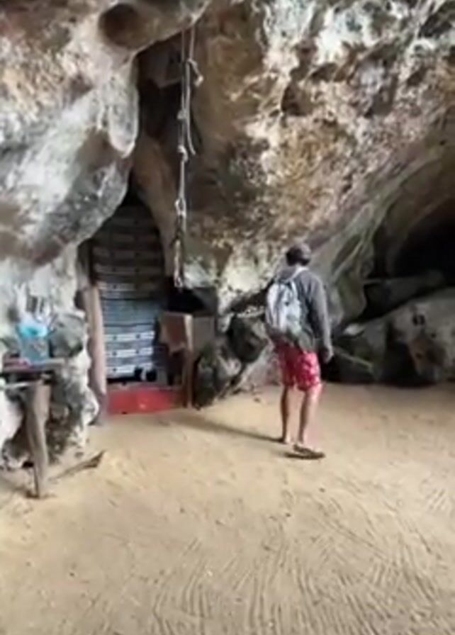 person walking out of a rocky cave. The cave has a simple shelter with a bed inside. The person is wearing shorts, a shirt, and a backpack. Outside the cave, there is a sandy path leading to the beach, surrounded by trees and vegetation. The sky is bright and overcast.