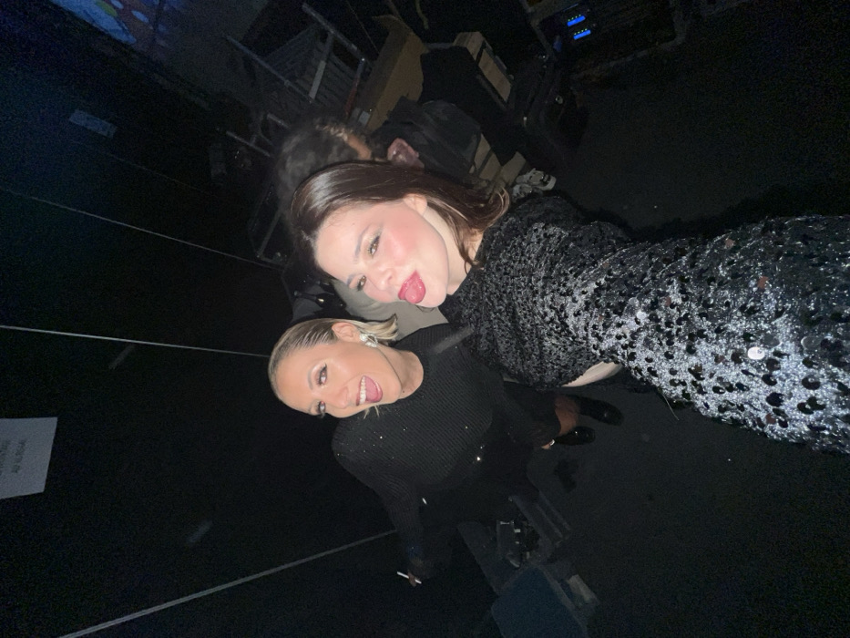 Two women in black, sparkly dresses pose cheek-to-cheek. The woman on the right has dark hair and sticks her tongue out. The woman on the left has blonde hair and smiles widely, showing her teeth. They are at a venue with dark floors and walls. Behind them are stairs. A sign hangs on the left side of the image.