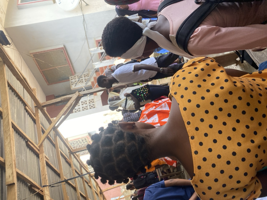 The scene depicts a daylight gathering in an urban area of Ibadan, Nigeria. Overhead, a rudimentary structure features exposed wooden beams supporting a corrugated metal roof. In the background, a multi-story, light-colored concrete building has windows with red frames, decorative blockwork, and an externally mounted satellite dish. Electrical wiring hangs from the roof structure. In the foreground, two individuals are viewed from behind. The person on the left wears a yellow top with black polka dots and has dark hair styled into numerous small knots. The person on the right wears a light pink long-sleeved top, a black backpack, and a white headscarf tied at the back of the head. In the midground, a group of people is present. A man in a white t-shirt and a watch on his left wrist is visible, facing a woman wearing a white head covering and a dark top with a colorful pattern, indicating an interaction. Other individuals in the midground and background wear various casual attire, including an orange and white patterned fabric and a light pink garment.
