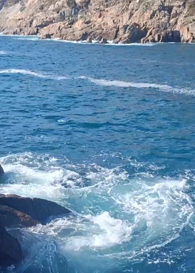 coastal scene with blue water, rocky cliffs, and breaking waves. The water is deep blue with white foamy waves crashing against dark, jagged rocks in the foreground. In the distance, reddish-brown cliffs extend into the water, with some greenery visible on top. The water has some streaks of white foam further out, possibly indicating stronger currents or turbulence. The scene is bathed in sunlight, with a clear sky suggesting a sunny day.