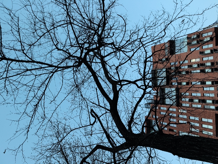 The image depicts an upward-angled view of a modern urban environment in Sofia, Bulgaria, specifically identifiable as Sofia Tower 1, part of the Sofia Office Center complex on Tsarigradsko Shose Boulevard. In the foreground, a large, leafless deciduous tree is silhouetted against the sky and the building, its dark trunk occupying the left side of the frame and its bare branches spreading across the upper and right portions. Behind the tree, a multi-story building constructed with reddish-brown brick is visible. This building features an irregular pattern of rectangular windows, some recessed and others flush, interspersed with larger reflective glass sections. The sky above is a clear, light blue. A small, dark silhouette of an aircraft is present in the upper-left quadrant of the sky. No individuals, direct actions, or interactions are visible.