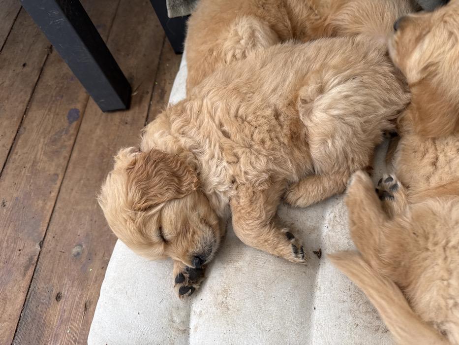 - "An overhead view captures at least three golden retriever puppies sleeping" by FM-Eqgh52, licensed under CC BY 4.0