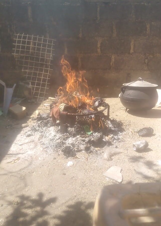 A fire burns on the ground in a space between a brick wall and a cast concrete surface. The fire is orange and yellow, with plumes of white smoke rising. There is a metal grid to the left of the fire, and a black pot behind the fire. There are ashes around the fire, and some scattered debris. A tree branch casts a shadow to the right of the scene.