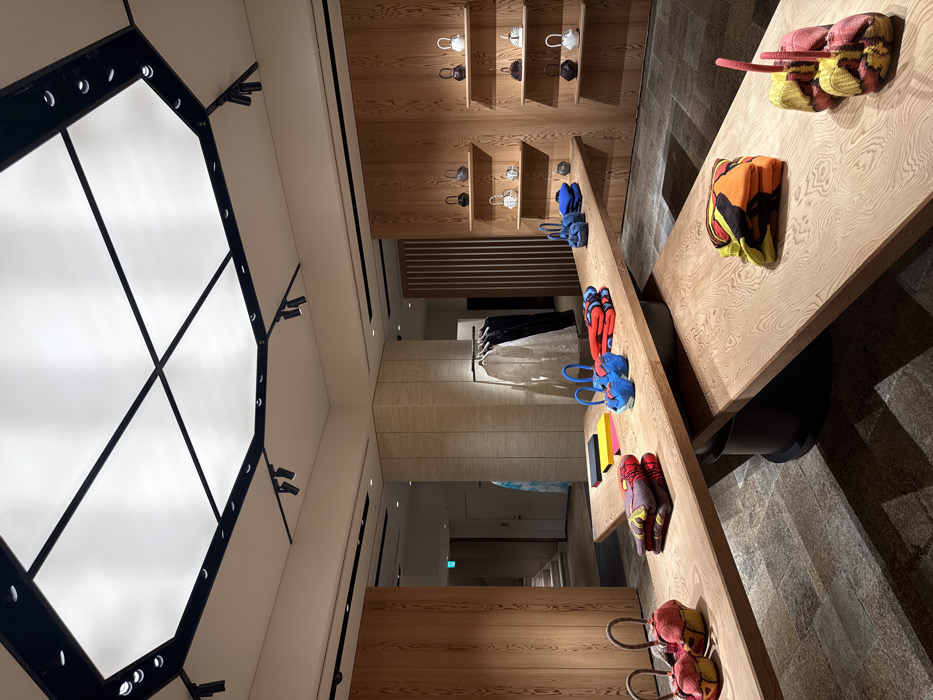 The image displays the interior of a retail establishment located in Chuo, Japan. The scene presents a well-lit space characterized by modern design elements, primarily natural light-toned wood paneling on walls and prominent display fixtures. In the central foreground and midground, a large, multi-level display table constructed from light-colored wood with visible grain occupies the space. This table is angular and appears to be made of interconnected segments, supported by dark, cylindrical bases. Merchandise is arranged across its surface: - On the upper left segment, two small, multicolored woven bags with loop handles (featuring red, yellow, and brown tones) are present. To their right, a stack of folded textiles or garments displays abstract patterns in purple, black, red, and yellow. Further right, a set of stacked rectangular objects (likely books or boxes) in yellow, red, and black are visible. Next to these, two small blue woven bags and a stack of folded textiles in blue, red, and black are positioned. - On the lower right segment of the table, a stack of folded textiles in orange, black, and yellow patterns is displayed, along with two more small, multicolored woven bags (yellow and red). The right wall features extensive vertical light wood paneling and incorporates two sets of three open, rectangular shelves. Each shelf displays small, rounded bags or decorative objects in a variety of colors including white, black, gray, and brown. In the background, a central structural pillar is covered in a light, textured material. To the left of this pillar, a large wooden door or partition is partially open, revealing a hallway with a staircase and a visible green exit sign. Behind the central pillar and display table, a clothing rack holds several garments, including a white sheer top and dark trousers or a dress. Another vertical slatted wooden partition is visible on the far right background, suggesting a division within the store. The ceiling features a large, octagonal light fixture composed of translucent white panels framed by dark, structural elements. Additionally, multiple black track lighting fixtures with adjustable spotlights are mounted along the dark frame of the octagonal light and elsewhere on the ceiling, providing focused illumination. The floor consists of dark, irregularly shaped stone or tile, creating a mosaic-like pattern. No individuals are present within the frame.