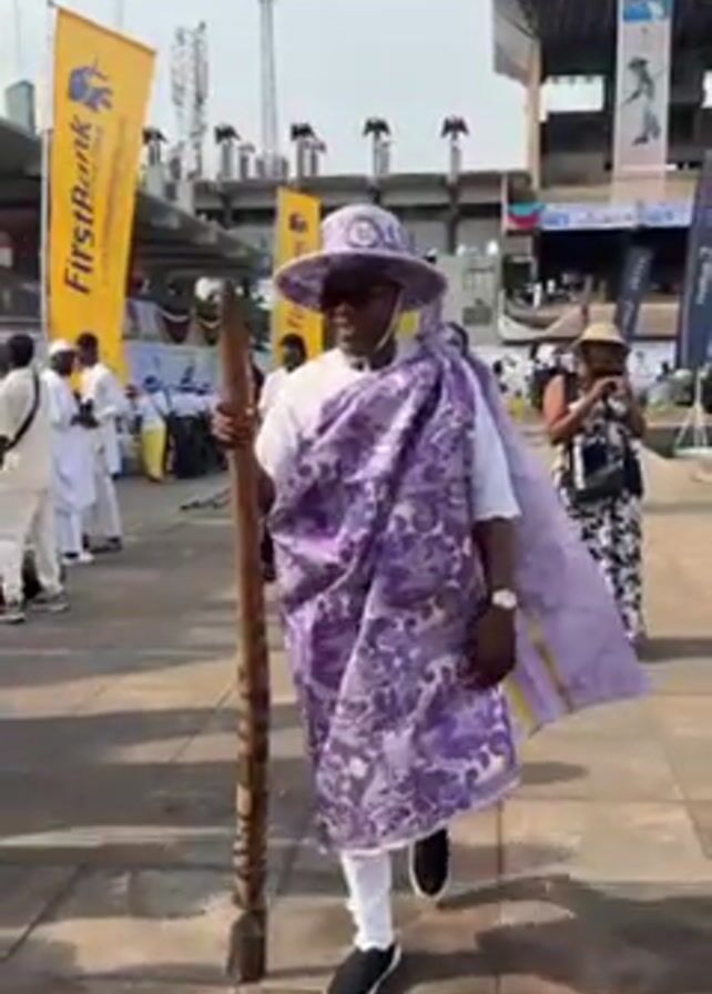 A man in a distinctive purple and white outfit walks across a paved area, holding a tall, wooden staff. He is wearing a white shirt and pants, black shoes, a purple patterned hat, and a matching purple shawl draped over his shoulder. Behind him are other people, some in white attire, and vendor banners with the logo for FirstBank. In the background is a large stadium. The man walks towards the camera. The sun appears to be shining. There is music playing.
