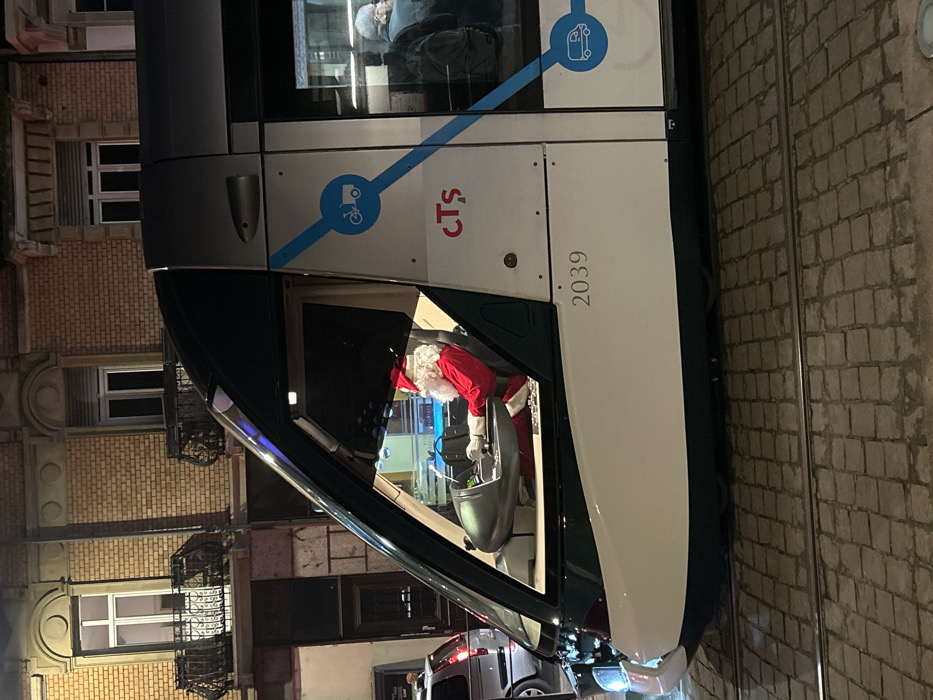 Santa Claus is driving a modern, white and green streetcar. The number 2039 is displayed on the side of the tram. A blue logo indicates bike-friendly transport. Buildings line the background. The tram tracks are visible on the ground, indicating it is on a street. Other cars are also present. The picture is rotated.
