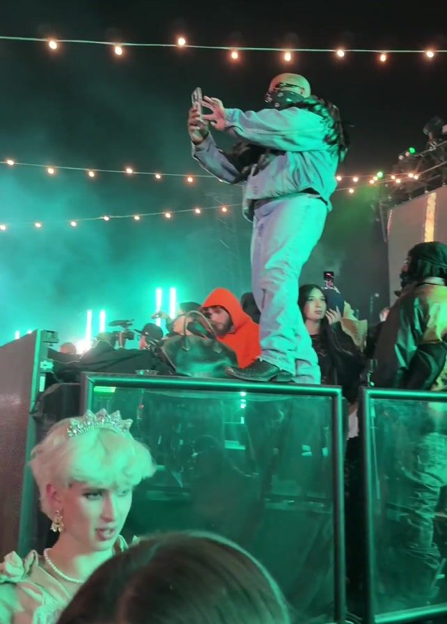 crowd of people at an outdoor concert at night. The stage is lit up with green lights and there are string lights overhead. A person is standing on top of a barricade taking pictures of the crowd. There is a woman in the foreground wearing a crown and pearls. The crowd is dancing and cheering.