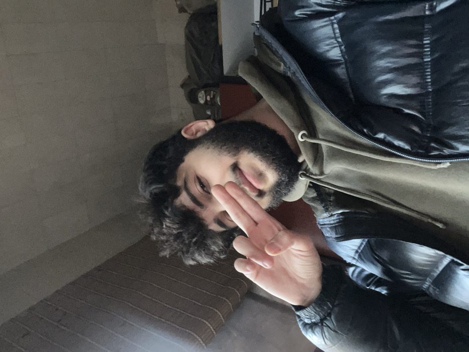 A male subject is depicted in an upward-angled close-up, originating from Al-Qanawat Municipality, Syria. The individual is a young adult with dark, curly hair and a full beard. He is wearing a dark, glossy puffer jacket over an olive-green hooded sweatshirt. The subject gazes directly into the camera with a subtle smile. His right hand is raised, positioned to the left of his face, displaying a "peace sign" gesture with the index and middle fingers extended. The background indicates an indoor setting. To the subject's left, a brownish-beige surface with a vertical striped pattern is visible. To his right, a dark furniture surface holds a dark, folded textile item and a small, dark bottle with a white label. The ceiling appears light grey.
