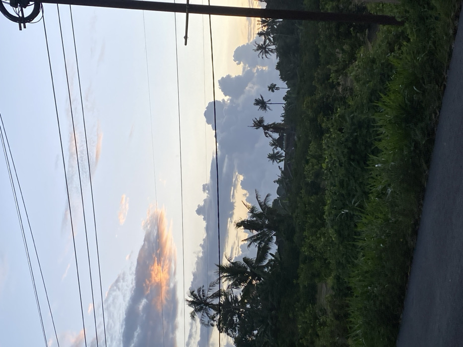 The image depicts an outdoor landscape scene at twilight (either dawn or dusk) in Gadingrejo, Indonesia. The upper half of the frame showcases a sky transitioning from a light blue at the top to a pale yellow-orange near the horizon. Scattered cumuliform clouds, predominantly grey-white, occupy the mid-sky, with some higher, wispy clouds displaying a faint orange hue. Several thin, dark horizontal utility lines traverse the sky. The lower two-thirds of the image are densely covered with tropical vegetation, including numerous dark green palm trees silhouetted against the sky, and a thick undergrowth of shrubs and grasses. A dark, paved road is visible in the bottom left foreground, bordered by a strip of taller green grasses. On the far right, a dark utility pole, equipped with circular attachments and horizontal cross-arms, extends vertically from the bottom edge towards the top, with wires originating from it. No individuals or specific actions are observed in the scene.