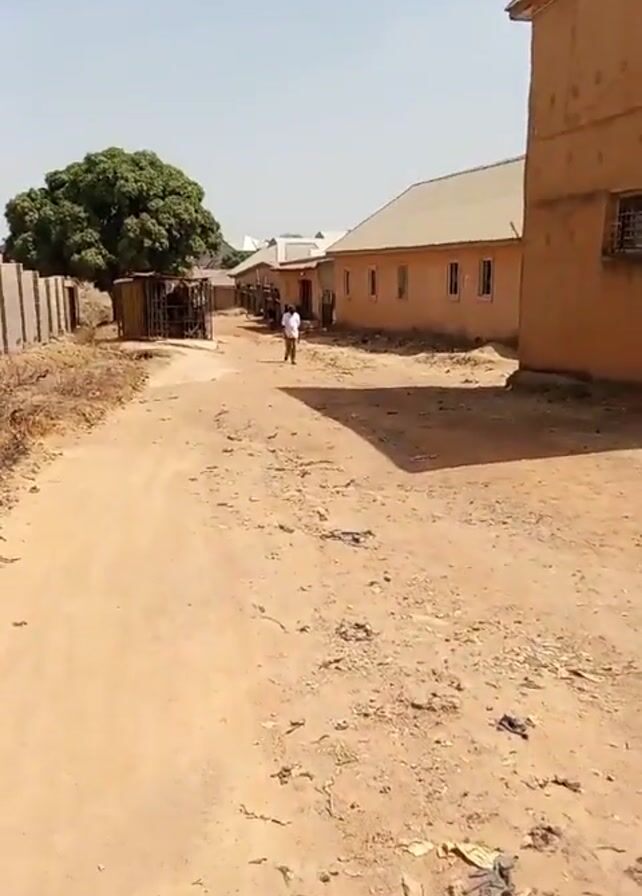 dirt road in a neighborhood. The road is sandy and covered with debris, including trash and leaves. On the left side of the road is a concrete block fence and a leafy tree, and on the right side are buildings, likely houses, with light-colored walls and roofs. A person wearing a white shirt is walking down the road, away from the camera. The sky is visible and appears to be clear. The scene is sunlit and dusty.