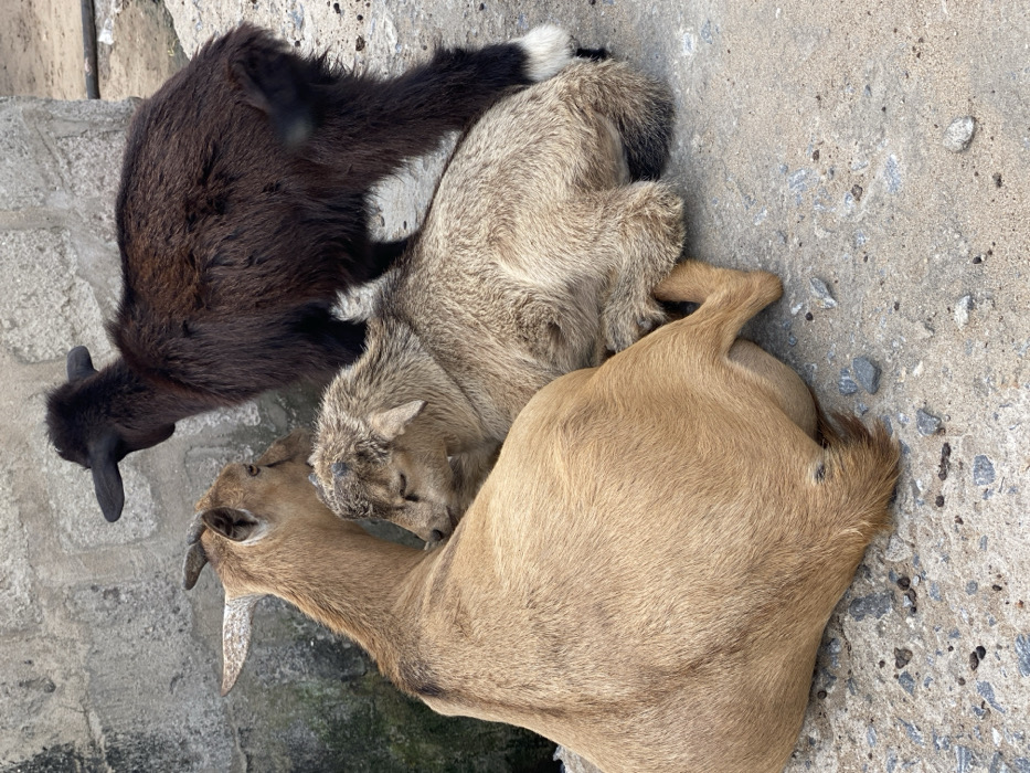 - "In Igbologun, Nigeria, three goats are observed on a concrete surface interspersed with small stones" by FM-PhEjP2, licensed under CC BY 4.0