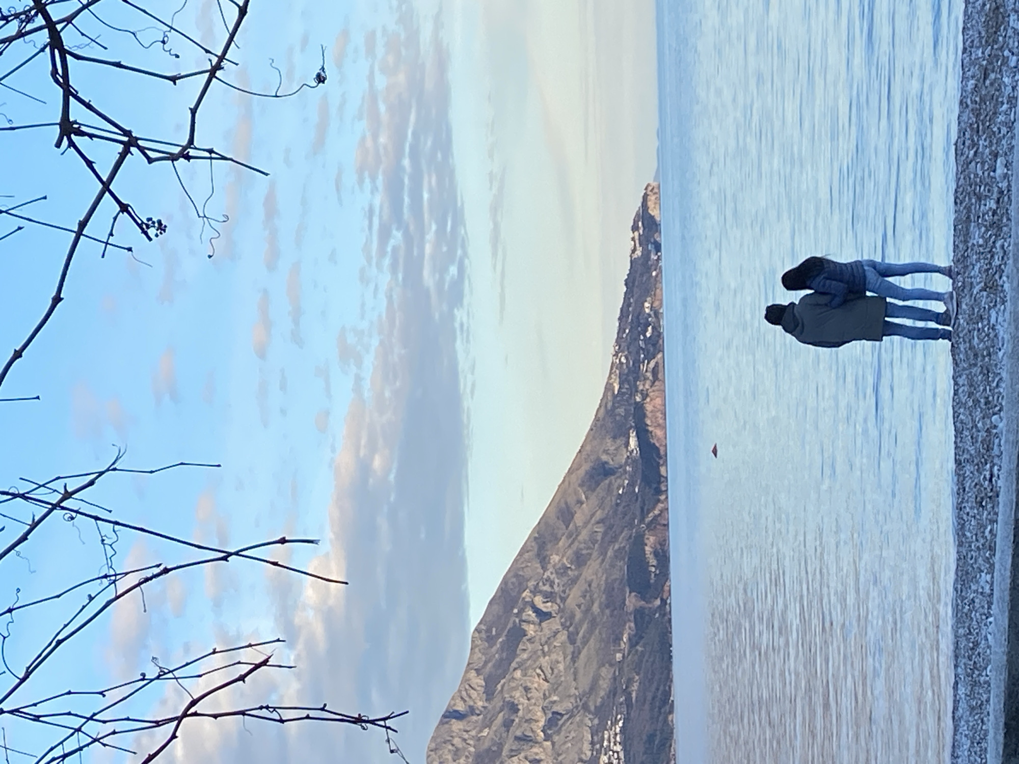 The image depicts a couple standing on the shore of a lake or sea. A mountain range is visible in the background and a leafless vine is in the foreground. The location is likely Budva, Montenegro, given the mountainous coastal environment.