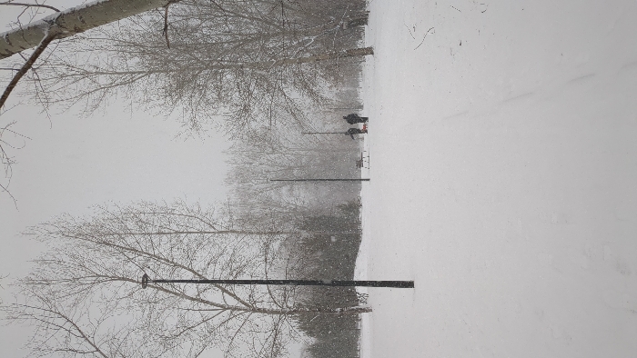 This image depicts a snow-covered park or wooded area in the city of Unknown, Unknown, during active snowfall under an overcast, grey sky
