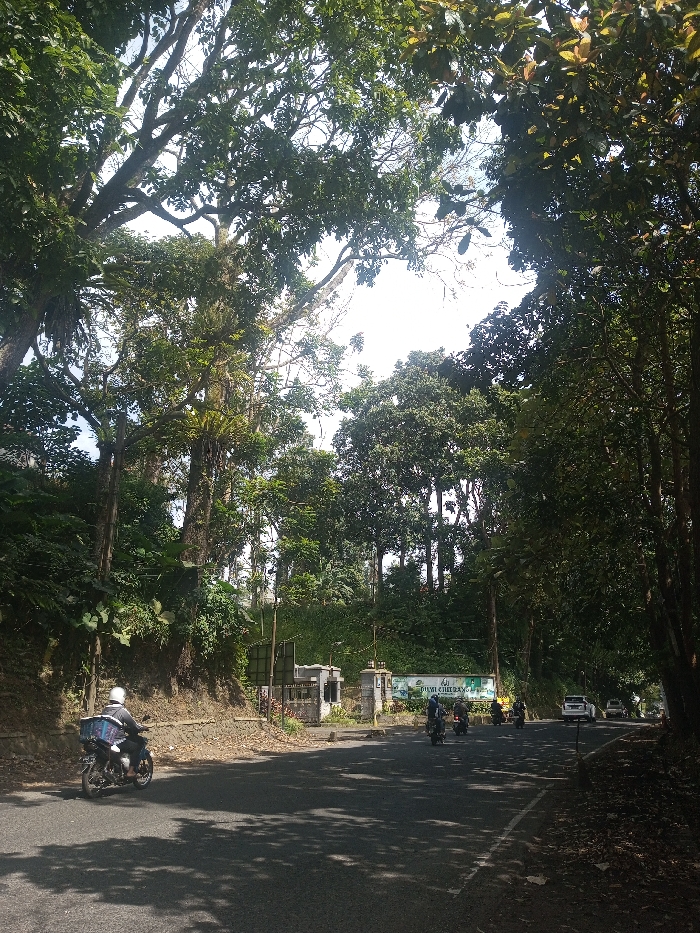 The image displays a paved two-lane road located in Niz Lakuk, India, under bright daylight conditions with significant areas of shadow. The road is bordered on both sides by dense, lush vegetation consisting of tall trees, ferns, and various green plants. In the foreground, a person wearing a white helmet and dark attire rides a dark-colored motorcycle away from the viewer, a white delivery box affixed to the rear of the vehicle. To the left, a steep, heavily overgrown embankment rises. In the midground, a gated entrance with two concrete pillars and an associated building is visible on the left side of the road, marked by a horizontal sign with a light blue background and white text that reads "BUMI CILETU." Further down the road, which curves slightly to the right, multiple additional motorcycles with riders and at least one white car are present. The sky is bright and clear, visible through gaps in the overarching tree canopy.