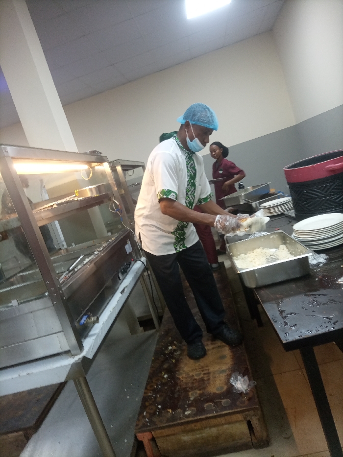 A man in a hairnet, mask, and gloves serves food onto plates. He stands on a small, soiled platform between two tables. He wears a white shirt with green trim and black pants and shoes. A woman in a burgundy uniform stands behind him. A food warmer is on the left. A stack of plates and a black and red bin are on the right. The room has white walls and a bright overhead light.