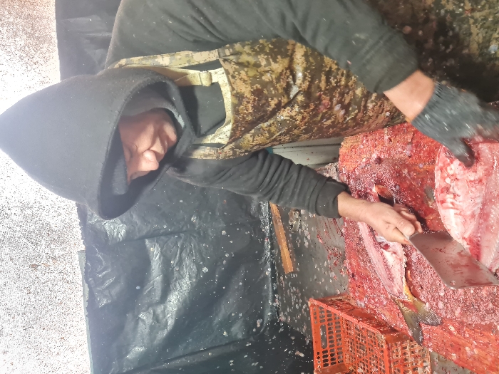 - "In an indoor fish processing area located in Qorowul, Uzbekistan, a single adult male is engaged in butchering fish" by FM-imY3G2, licensed under CC BY 4.0